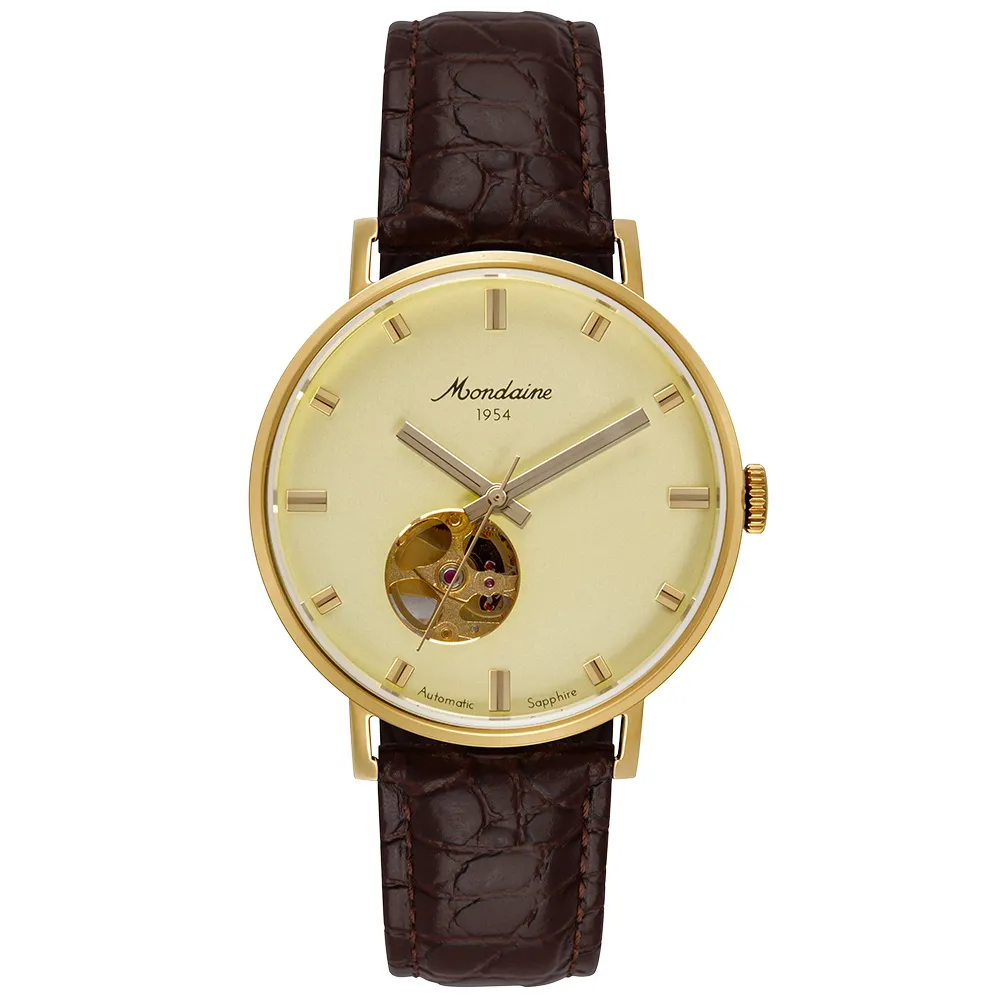 Este relógio automático dourado é uma peça marcante. Traz um toque exclusivo com vidro de safira resistente a riscos e maquinismo aparente no mostrador e no case back. Parte da coleção comemorativa dos 70 anos da Mondaine, este modelo celebra a herança da marca com a icônica logo vintage de 1954 no visor. A caixa em aço com 38 cm de diâmetro e a pulseira de couro garantem um visual clássico e atemporal, ideal para quem valoriza estilo e tradição.