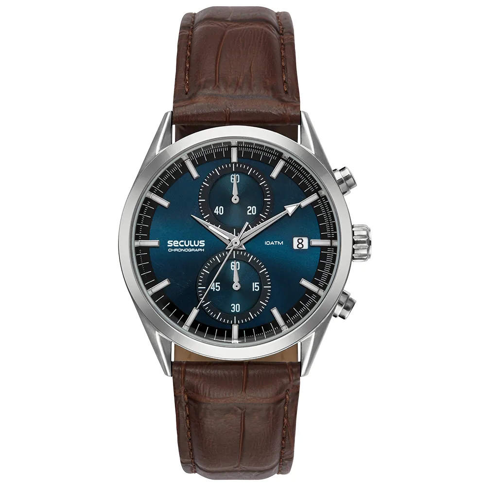 O Relógio masculino cronógrafo da marca Seculus, com caixa em aço inoxidável de cerca de 40 mm de diâmetro, mostrador azul, três subdials, função cronógrafo e calendário, ponteiros luminescentes, vidro mineral abaulado e pulseira de couro marrom texturizada.